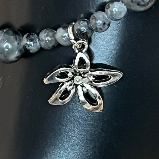 Larvikite and Carved Silver Obsidian Anklet with Silver Flower Charm