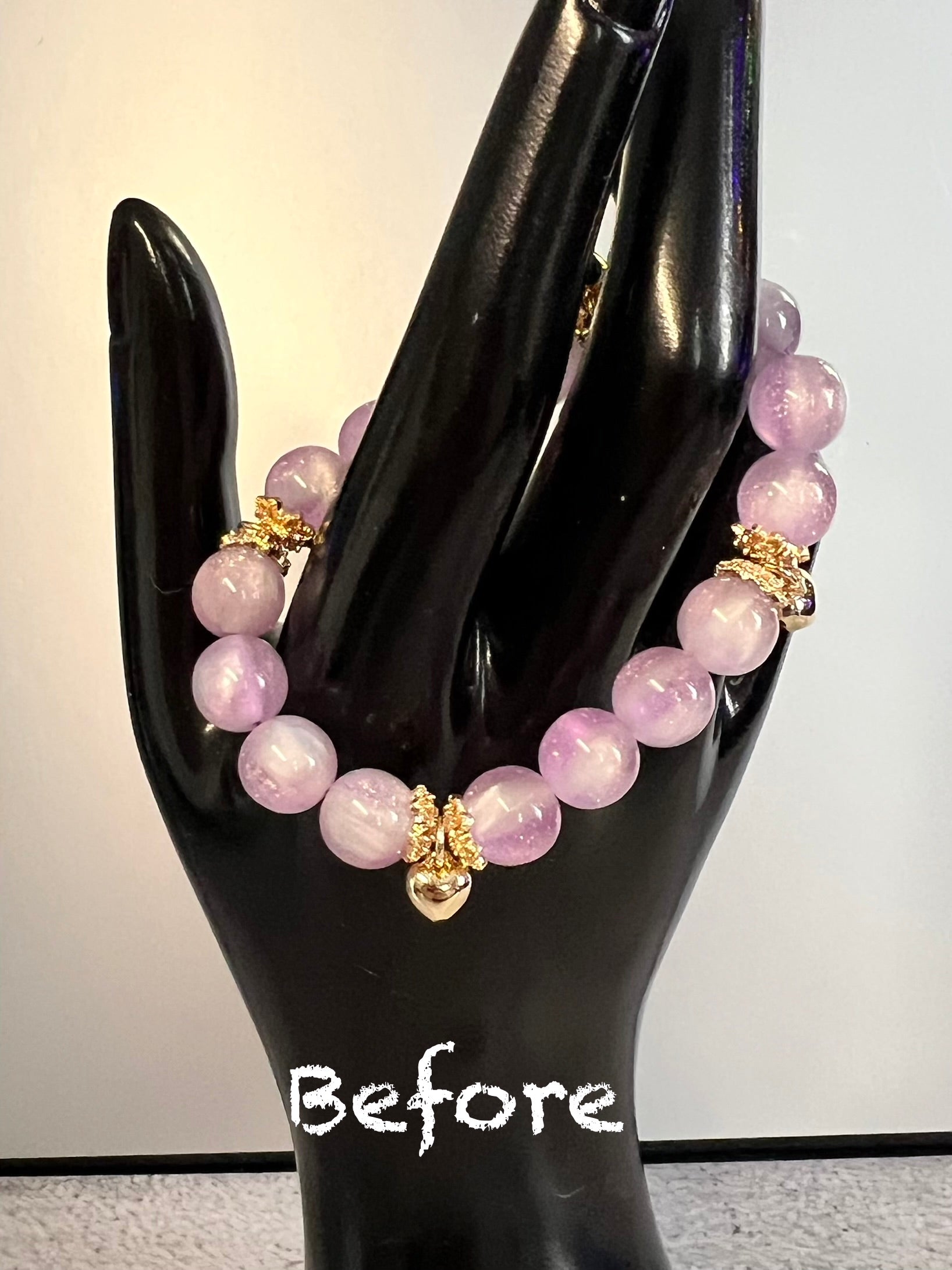Enhance your look with our Lavender Color Changing Stretch Bracelet! Watch as the light purple hue transforms into a deep periwinkle, adding a touch of novelty. Crafted with gold spacer beads adorned with delicate hearts, this bracelet fits comfortably up to a 5 3/4” wrist. A must-have for any fashion-forward individual.