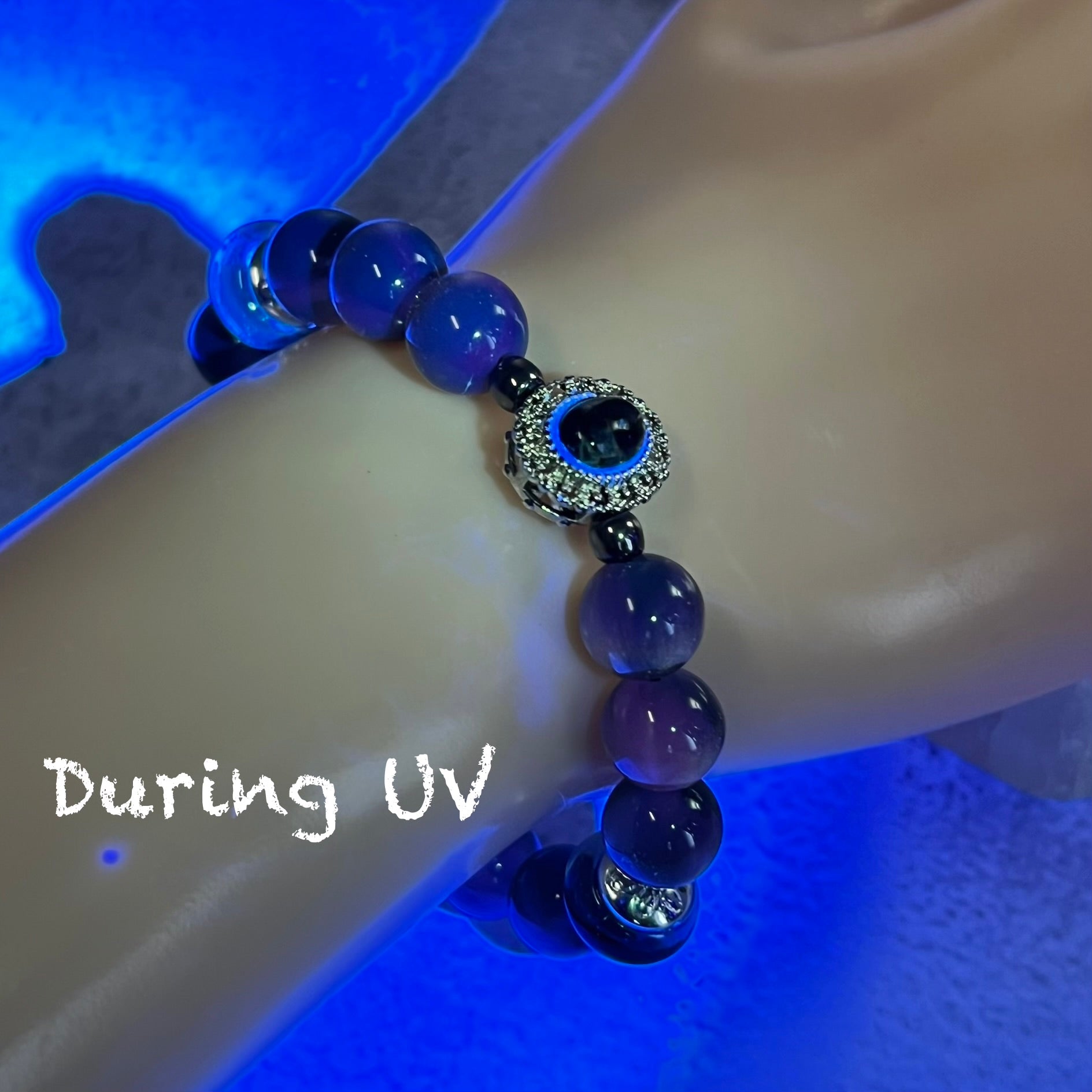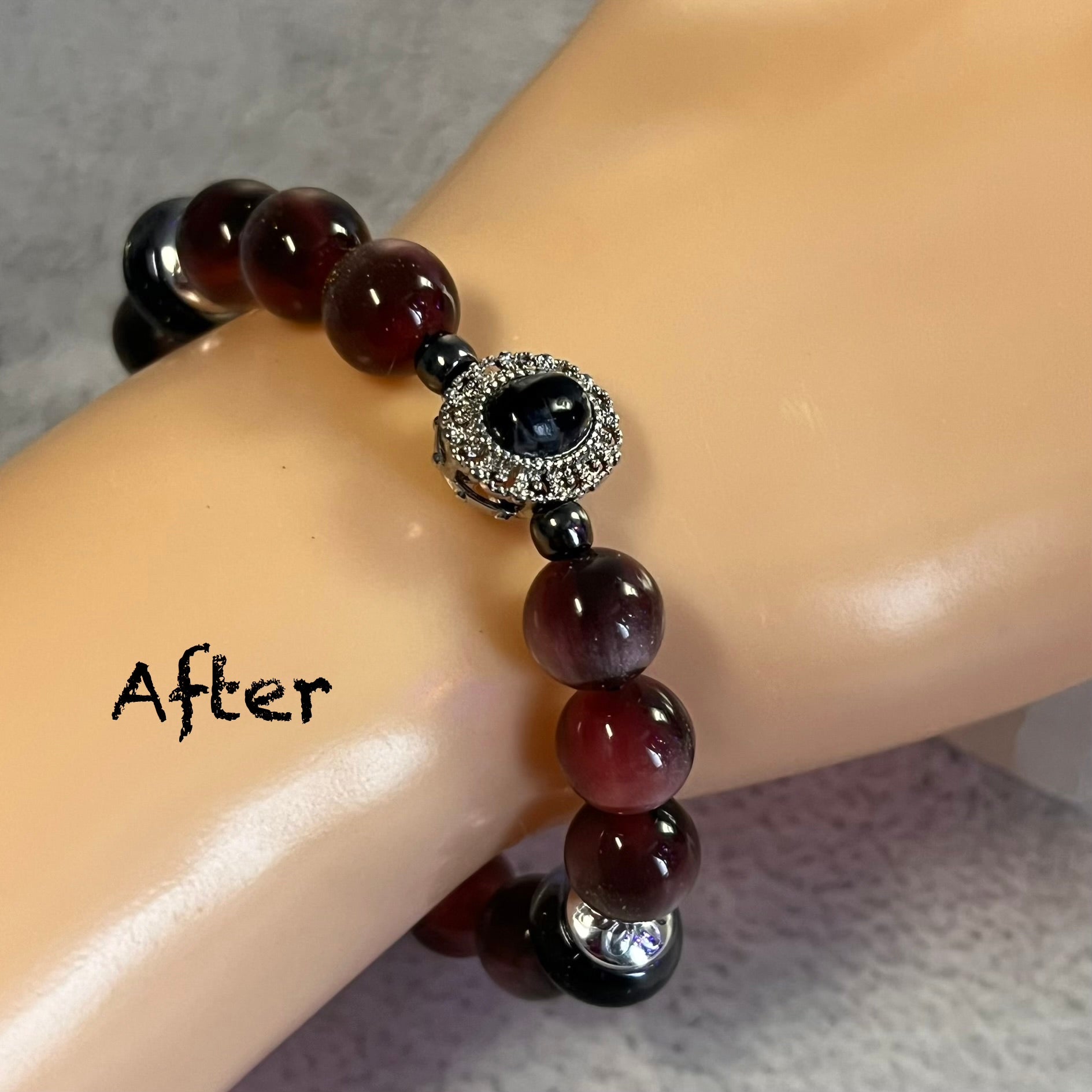 Experience a stunning transformation with our Silver and Grey Color Changing Stretch Bracelet. Crafted with expertly placed silver spacers and bead caps, this bracelet showcases a real obsidian cabachon focal stone. As you wear it, watch as the silver and grey hues magically transform into a deep plum shade. Designed to fit wrists up to 5 1/2", this bracelet is the perfect accessory for any occasion.